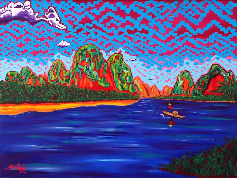 As a Sedona artist, I was privileged to showcase my vivid, mystical landscapes at a private art exhibition in Guangzhou, China, in January 2019. The event, held for private collectors, offered a unique opportunity to explore some of China’s most beautiful and culturally rich locations. Our travels took us to Yangshuo, where we experienced its electrifying nightlife and the captivating charm of old-world Chinese culture. It was in the serene Xingping Village that this artwork came to life, inspired by the breathtaking scenery and rich cultural heritage. This piece captures the essence of China’s natural and cultural splendor, inviting you to explore its beauty through art.